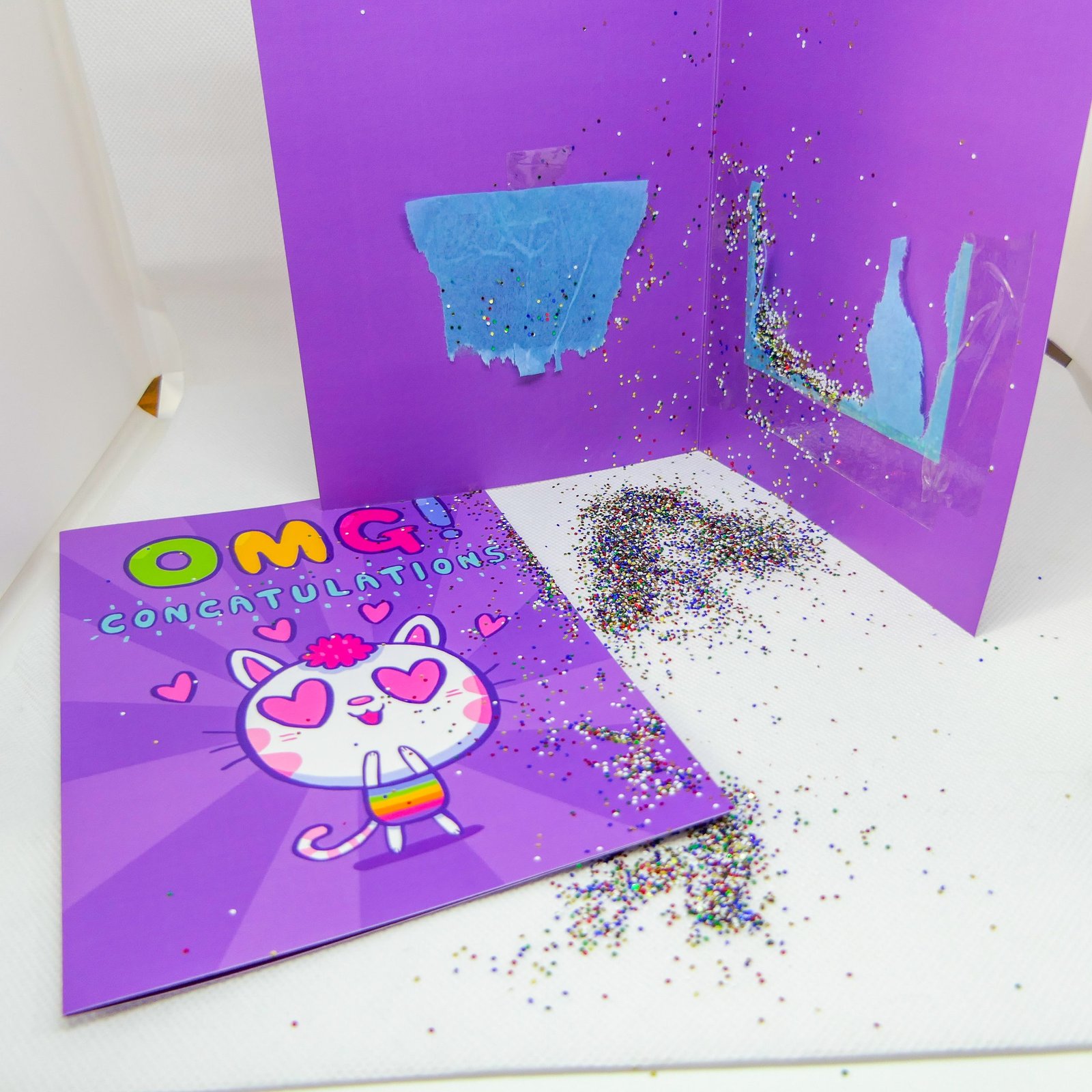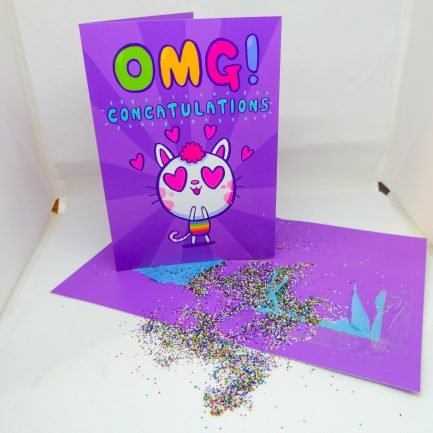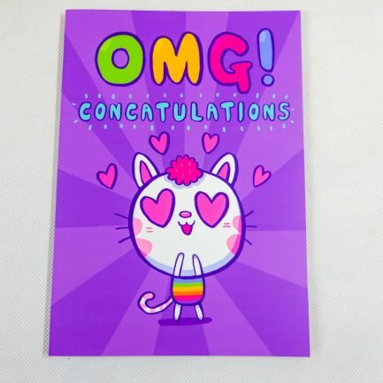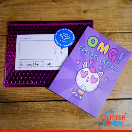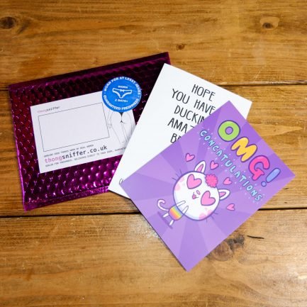 The package includes a high quality bubble envelope with a piece of french lace tactically hanging out of it, with a card inside explaining the prank, signed for by “anonymous “! and a congrats card with a custom message